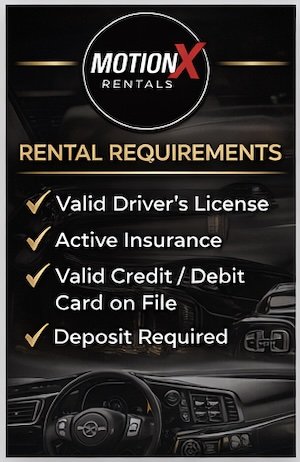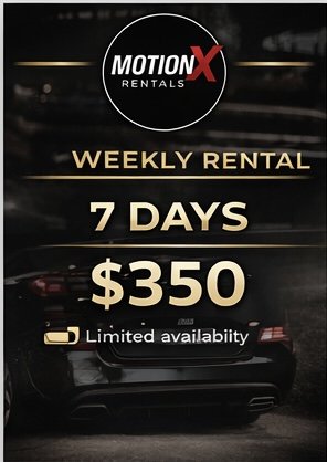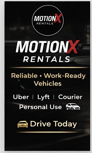MotionX Rentals is a vehicle rental company providing reliable, well-maintained cars with flexible weekend, weekly, and monthly rental options. We serve individuals and businesses looking for affordable and convenient transportation solutions. Our simple booking process and transparent pricing make renting easy and stress-free. At MotionX Rentals, we’re committed to keeping you moving with confidence.