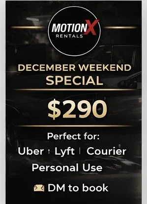MotionX Rentals specializes in providing reliable vehicles for rideshare drivers and medical couriers. Our flexible weekend, weekly, and monthly rental options are designed to support high-mileage use, consistent performance, and dependable transportation for work. We help professionals stay on the road with confidence and minimal downtime.